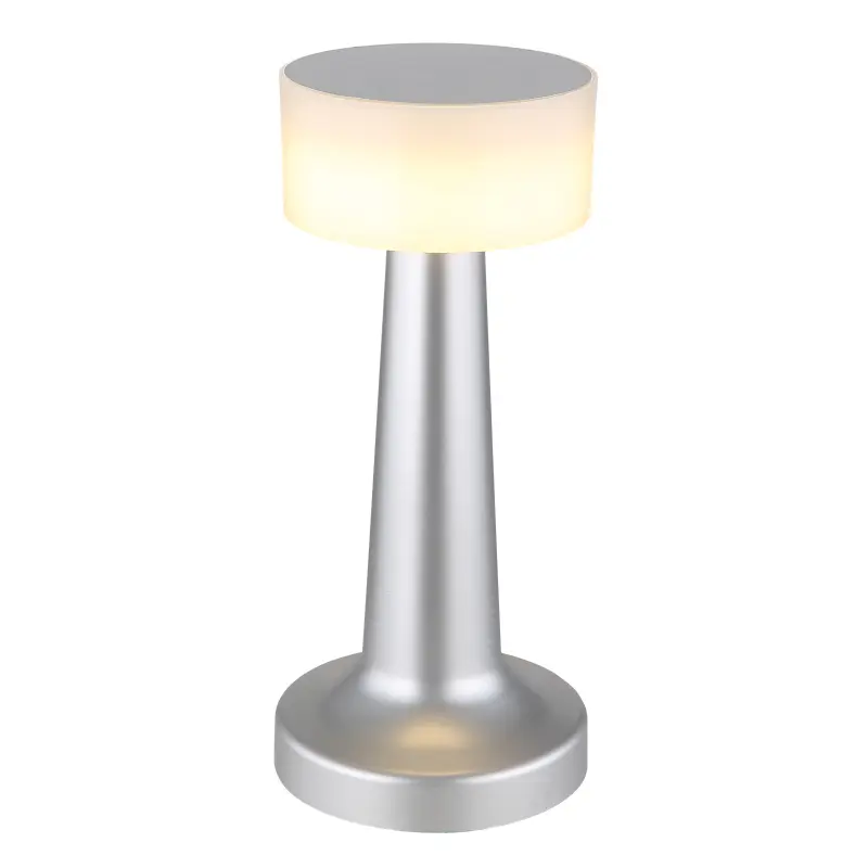 Nabíjateľná stolová lampa, plast nikel, plast biely, dotykové zapnutie/vypnutie, plynulé dotykové stmievanie, aku CR18650 800mAh 3,7V, doba nabíjania cca 2 hod., ø: 95mm, V: 215mm, dĺžka kábla 1500mm, vrátane LED 1W 230V, výstup 55lm, 2700/6500/4000K